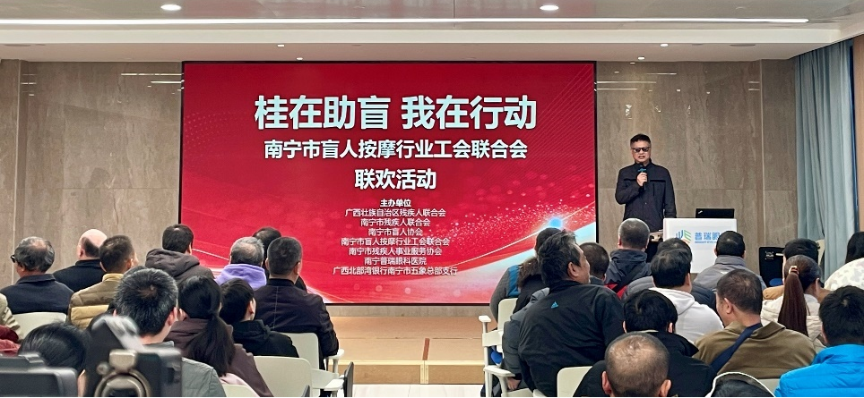 1月21日上午,由广西残联、南宁市残联、南宁市盲人协会、南宁市盲人按摩行业工会联合会、南宁市残疾人事业服务协会、南宁普瑞眼科医院等联合主办的“桂在助盲 我在行动——盲按工会联欢活动”在南宁普瑞眼科医院举办。活动旨在丰富盲人群体节日文化生活,提升其反诈意识和用眼健康知识,营造温暖、祥和的节日氛围。